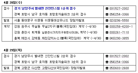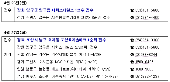 그밖에 강원 양구군 양구읍 서희스타힐스 251가구, 경북 포항시 효자동 포항솔파크 583가구 등이 분양을 계획하고 있다. 또한 4월 29일에는 제2차 보금자리주택지구의 사전예약에 대한 입주자모집공고가 발표될 예정이다.