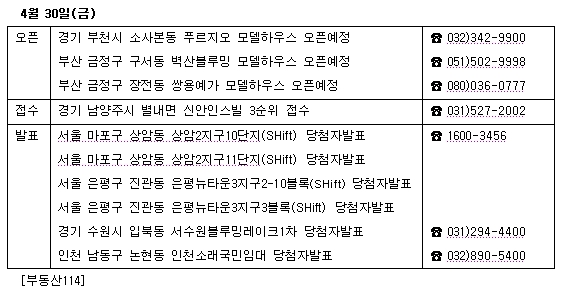 30일(금)에는 경기 부천시 소사본동 푸르지오 단지가 모델하우스를 오픈할 예정이다. 부산 금정구 구서동 벽산블루밍, 장전동 쌍용예가 단지도 모델하우스를 오픈한다.