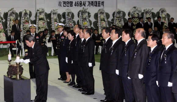 정운찬 국무총리를 비롯한 국무위원들이 25일 오후 평택 해군 2함대 체육관에 마련된 '천안함 46용사 분향소'를 방문, 헌화ㆍ분향하고 있다.