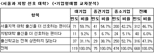 ‘서울지역 대학 출신자를 더 선호 한다’고 답한 곳은 대기업(59.7%)과 중견기업(54.7%)이 가장 높은 반면, ‘출신학교는 전혀 상관이 없다’는 답변은 중소기업이 52.7%로 가장 많았다.