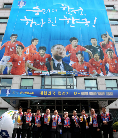 월드컵 대표팀의 승리기원 슬로건 제막식이 27일 서울 종로구 신문로에 위치한 축구회관에서 열렸다. 조중연 축구협회장과 남아공월드컵 단장인 노흥섭 축구협회 부회장 등 관계자들이 승리를 기원하고 있다.