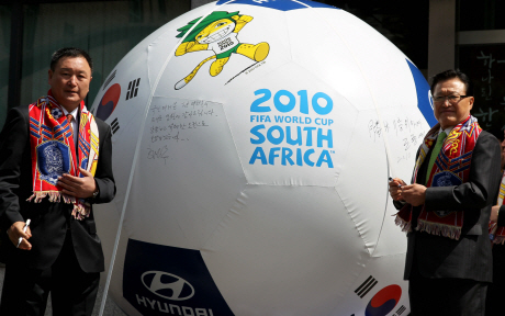 조중연(오른쪽) 축구협회장과 허정무 대표팀 감독이 대형 축구공에 승리를 기원하는 글을 쓰고 있다.