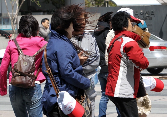 27일 수도권 인근 지역에 강풍주의보가 내려진 가운데 서울 청계 광장에서 관광객들이 갑작스런 강풍에 시민들이 바람을 맞고 있다.