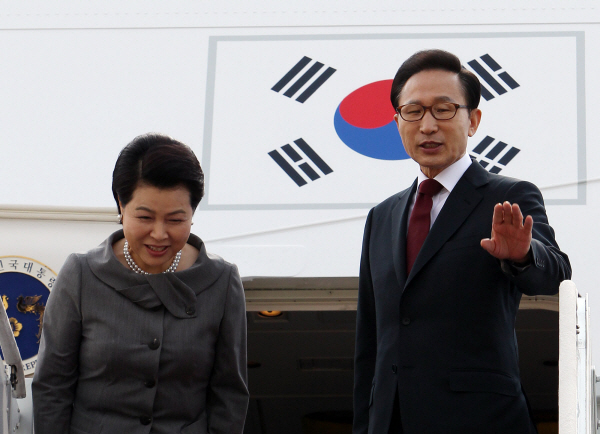 중국 상하이(上海)를 방문하는 이명박 대통령과 부인 김윤옥 여사가 30일 오전 서울공항을 통해 출국하며 손을 들어 인사하고 있다.