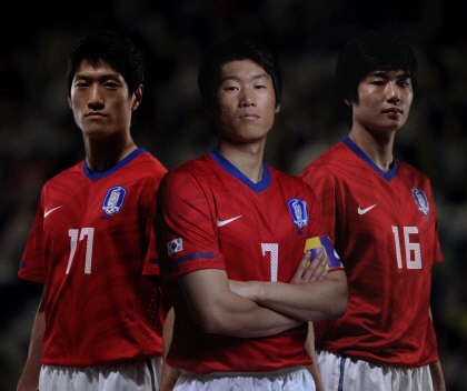 한국 축구대표팀이 6월 남아프리카공화국에서 열리는 월드컵에서 입을 홈 유니폼이 30일 공개됐다. 대표팀 후원을 맡은 나이키가 공개한 이번 유니폼은 예전보다 더 강렬해진 붉은색 상의에 호랑이 무늬로 디자인됐다. 왼쪽부터 이청용, 박지성, 기성용 선수가 포즈를 취하고 있다.