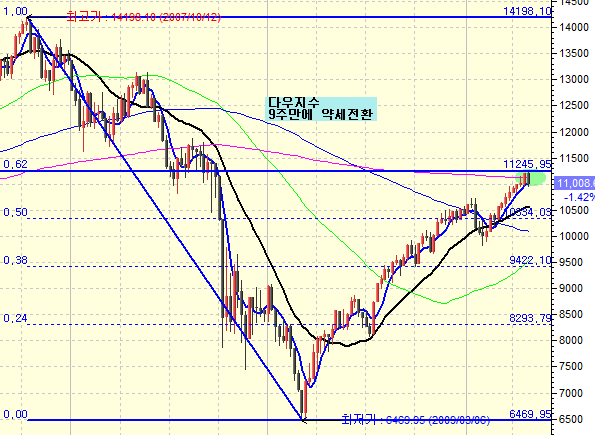 8주 연속 랠리를 펼치던 다우지수는 9주만에 약세(-1.75%)로 돌아섰다.