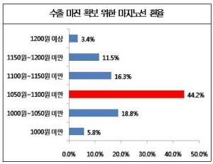 원·달러 환율 하락세가 지속되고 있는 가운데 국내 수출기업 3곳 중 1곳은 수출 마진 확보를 위한 마지노선이 이미 무너졌거나 근접하고 있는 것으로 드러났다.