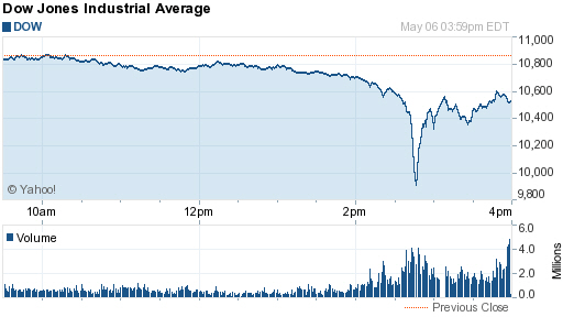 시장의 불안심리를 반영하듯 이날 다우지수는 장중 1000포인트 가까이 폭락했다. 트레이더의 주문 실수에 따른 헤프닝으로 가닥을 잡고 있지만 시장이 그만큼 극도로 불안하기 때문이라는 것이 전문가들의 분석이다.