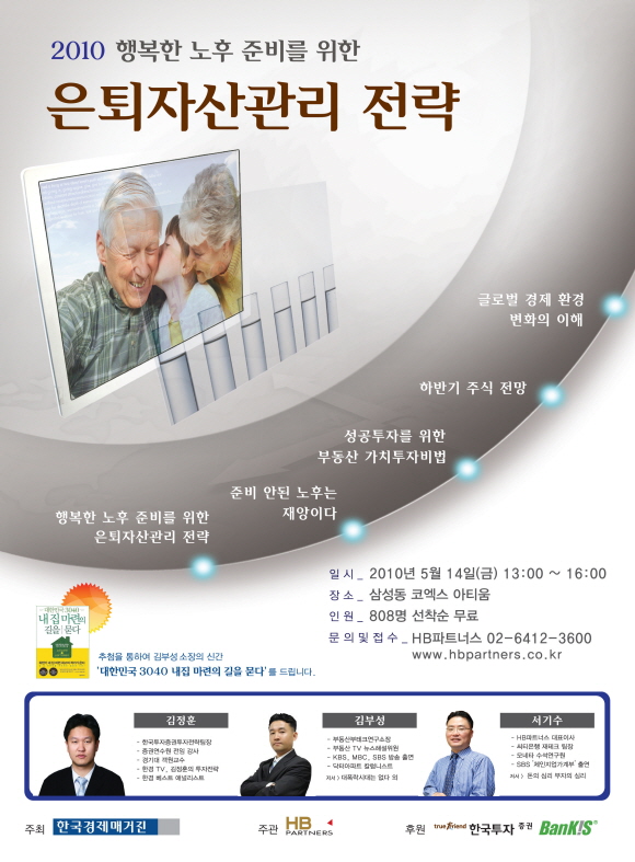 마지막 3부에선 HB파트너스 서기수 대표가 '은퇴 자산관리 전략은 이렇게 하라'는 주제로 강연한다.