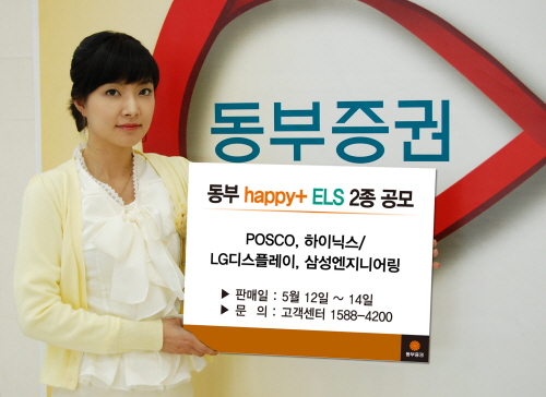 LG디스플레이와 삼성엔지니어링을 기초자산으로 하는 ‘동부 happy+ 파생결합증권(ELS) 제262회’는 3년 만기 상품으로 6개월 주기의 조기상환평가일 및 만기평가일에 기초자산의 종가가 최초기준가격의 90%(6,12개월), 85%(18,24개월), 80%(30,36개월) 이상이면 연 22.2% 수익이 지급된다.