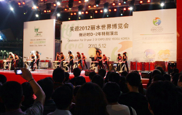 이날 행사에는 김근수 여수박람회 조직위 사무총장과 천셴진 상하이엑스포 사무협조국 부국장 등 양국 엑스포 관계자들과 교민대표, 아시아 국가관 관계자 등 500여명이 참석한 가운데 베이징올림픽 개막식에 참여했던 블랙드럼팀과 탭댄스, 비보이 등이 참가하는 역동적인 공연이 열렸다.