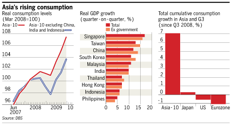 아시아 지역의 개인소비가 증가하면서 수출 위주 성장전략을 택했던 아시아 각국에도 변화의 조짐이 보이고 있다.
