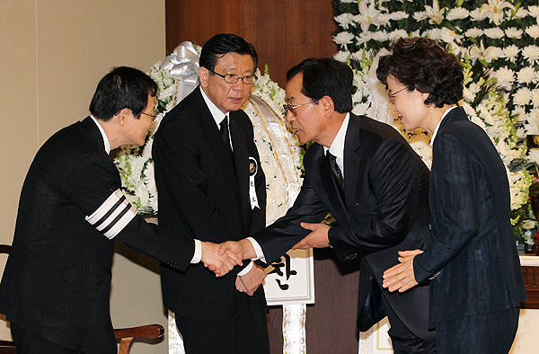 금호아시아나그룹 故 박인천 회장의 부인인 이순정 여사의 장례식 이틀째인 13일 오전 빈소가 차려진 신촌 세브란스 장례식장에서 박삼구 명예회장과 박찬구 회장이 조문객을 맞고 있다.