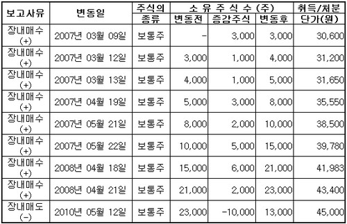 하지만 이때를 바닥으로 주가는 1분기 실적에 대한 기대감으로 상승하기 시작했으며 2~3분기에도 호실적이 이어질 것으로 전망되면서 4월30일 4만7900원까지 치솟았다. 이후 5월 들어 유럽발 재정위기가 재차 부각돼 주가가 조정을 받으면서 권 사장은 3년만에 보유 주식 중 일부를 차익실현했다.