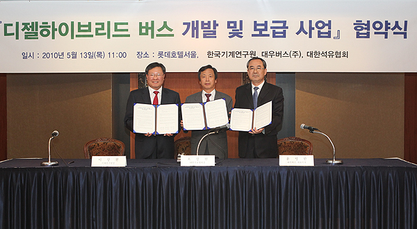 디젤하이브리드 버스 개발 및 보급 사업 협약식이 13일 소공동 롯데호텔에서 열린 가운데 이상천 한국기계연구원장(왼쪽부터), 오강현 대한석유협회장, 윤영환 대우버스 대표이사가 협약서를 들고 포토타임을 갖고 있다.
