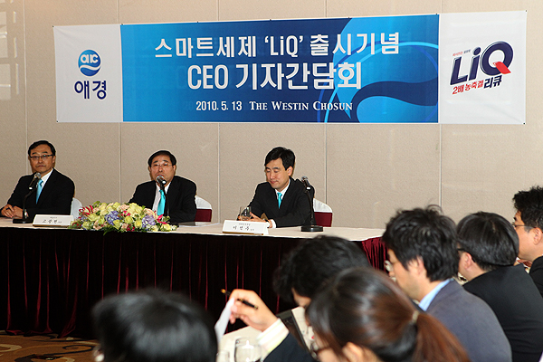 애경, 스마트세제 리큐(LiQ) 출시기념 기자 간담회가 13일 소공동 조선호텔에서 열린 가운데 고광현 대표이사(가운데)가 인사말을 하고 있다.