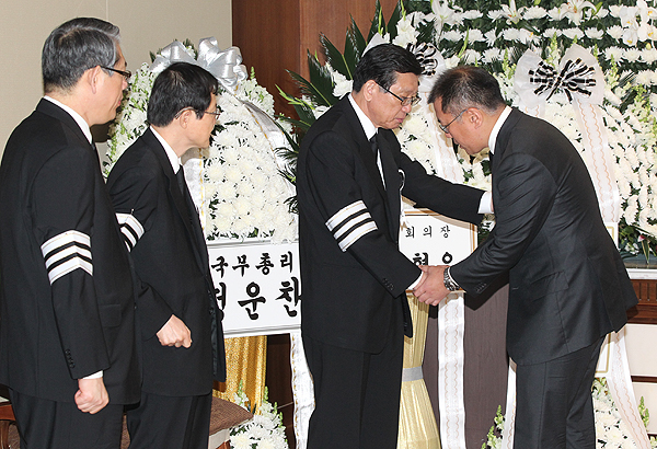 13일 오전 정의선 현대차 부회장이 금호아시아나그룹 故 박인천 회장의 부인 故 이순정 여사의 빈소가 있는 신촌 세브란스 장례식장에서 조문을 마치고 박삼구 명예회장을 위로하며 악수를 나누고 있다.