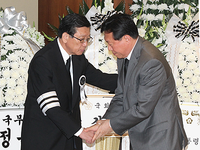 13일 신동빈 롯데그룹 부회장이 금호아시아나그룹 故 박인천 회장의 부인 故 이순정 여사의 빈소가 있는 신촌 세브란스 장례식장에서 조문을 마치고 박삼구 명예회장을 위로하며 악수를 나누고 있다.