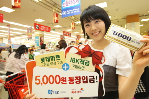 롯데마트에서 7만원 이상 구매고객에게 '기업은행 통장개설 입금지원 쿠폰(5000원권)'을 증정하고 쿠폰을 소지한 고객이 적금통장을 개설하면 초입금으로 5000원을 입금해 주는 행사이다.