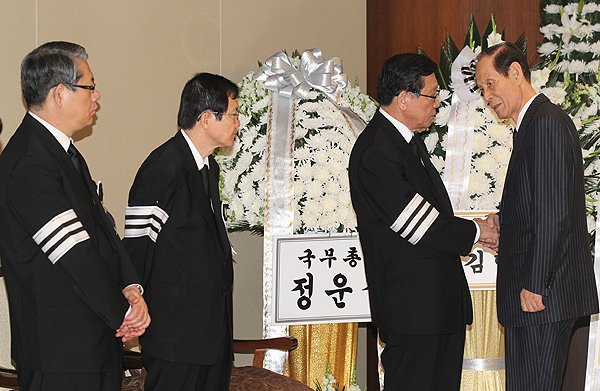 13일 이만섭 전 국회의장이 금호아시아나그룹 故 박인천 회장의 부인 故 이순정 여사의 빈소가 있는 신촌 세브란스 장례식장에서 헌화 후 박삼구 명예회장을 위로하며 악수를 나누고 있다.