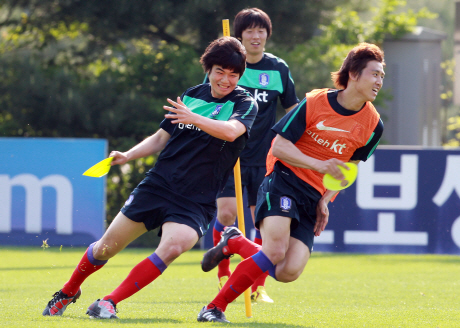 축구국가대표 기성용(왼쪽)과 구자철이 13일 오후 파주NFC(대표팀트레이닝센터)에서 열린 대표팀 훈련에서 릴레이 경주를 하고 있다. 대표팀은 오는 16일 오후 7시 서울월드컵경기장에서 에콰도르와 평가전을 치른다.