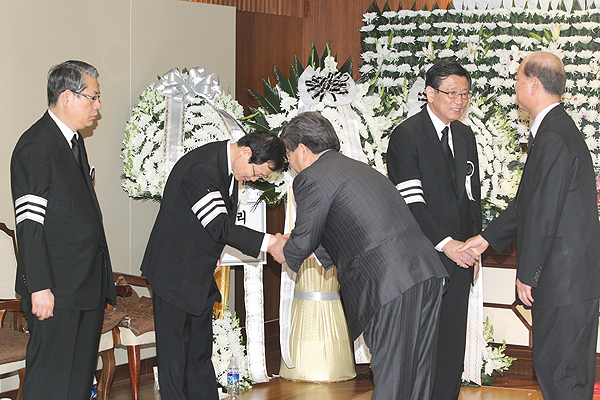 13일 금호아시아나그룹 故 박인천 회장의 부인 故 이순정 여사의 빈소가 마련된 연세대 세브란스 병원을 찾은 민유성 산업은행장이 조문하고 있다.