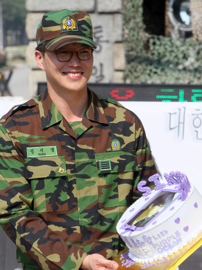 17일 오전 강원 원주시 제1군사령부앞에서 전역한 가수 성시경이 팬들이 준 케이크를 들고 포즈를 취하고 있다.
