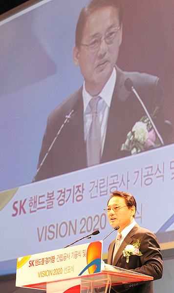 'SK 핸드볼경기장 건립공사 기공식 및 VISION 2020 선포식'이 17일 올림픽공원 내 펜싱경기장에서 열린 가운데 유인촌 문화체육관광부 장관이 축사를 하고 있다.