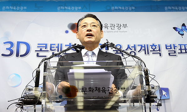 유인촌 문화체육관광부 장관이 19일 오전 문화부 7층 기자실에서 기자간담회를 갖고 3D 콘텐츠산업 육성계획안을 발표하고 있다.