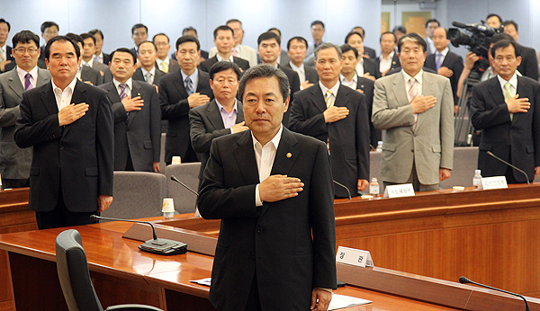 27일 서울 광화문 정부중앙청사별관에서 열린 천안함 사태 관련 전국 비상계획관 긴급 소집회의에서 맹형규 행정안전부장관과 참석자들이 국기에대한 경례를 하고 있다.