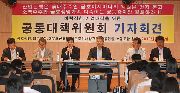 27일 오후 금호아시아나 1관 3층에서 바람직한 기업매각을 위한 공동대책위원회 기자회견이 열린 가운데 김욱동 대우건설 노동조합 위원장(왼쪽 세번째)이 모두발언을 하고 있다.