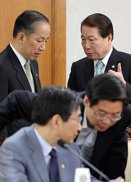 김태영 국방부장관과 유명환 외교통상부장관이 28일 서울 광화문 정부중앙청사에서 열린 국가정책조정회의에서 대화를 나누고 있다.
