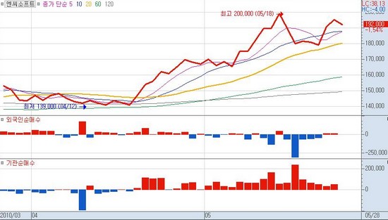 기관들은 유가증권시장에 상장된 대표 게임주인 엔씨소프트를 연일 순매수하고 있다. 아이온은 '리니지'와 '아이온' 등 국내 대표 온라인 게임 전문 업체이다.