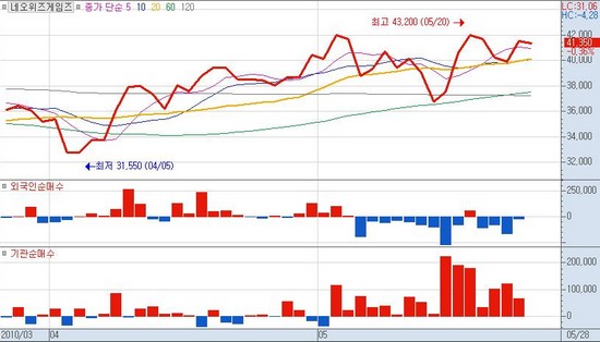 기관이 네오위즈게임즈의 순매수에 나선 것은 이달 4일부터 27일까지 16거래일 동안으로, 5월 들어 국내 증시가 대내외 악재로 급락하면서 네오위즈게임즈 역시 외국인이 대거 순매도에 나섰고 낮지 않은 가격대임에도 불구하고 이들 물량을 대부분을 소화해낸 것이다.