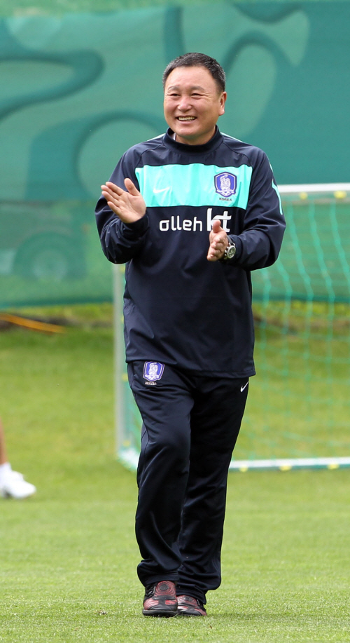 ▲ 29일(한국시간) 새벽 오스트리아 노이슈티프트 캄플 훈련구장에서 열린 축구대표팀 훈련에서 허정무 감독이 활짝 웃으며 박수를 치고 있다.(사진=연합뉴스)