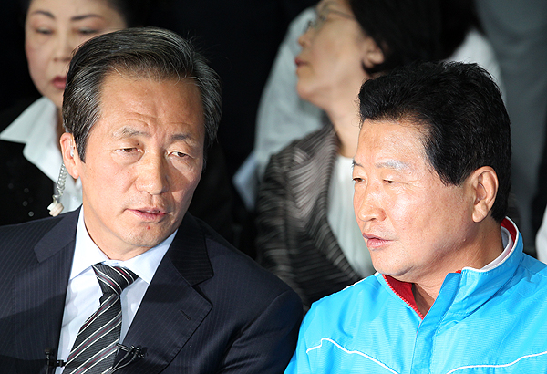 [포토]출구조사 결과 지켜보며 대화 나누는 정몽준 대표