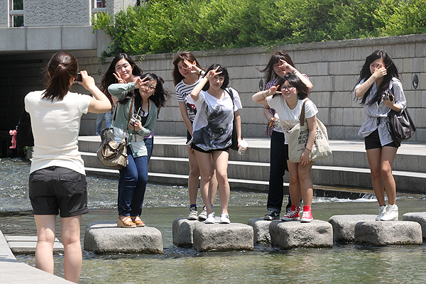 한여름 같은 날씨를 보인 4일 서울 청계천을 찾은 여대생들이 친구들과 즐거운 오후를 보내고 있다.