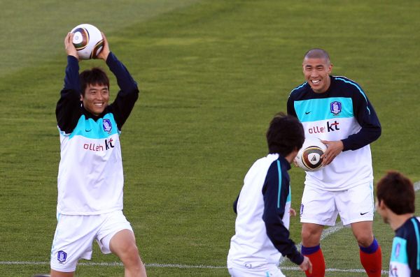 ▲5일 오후(한국시간) 남아프리카공화국 월드컵 캠프인 루스텐버그에 도착한 태극전사들이 훈련장인 올림피아파크구장에서 첫 훈련을 시작한 가운데 이동국과 차두리가 즐겁게 훈련하고 있다.(사진=연합뉴스)