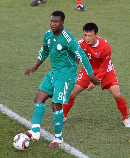 ▲6일 밤(한국시간) 남아공 요하네스버그 동쪽 템비사 마쿨롱 경기장에서 열린 나이지리아와 북한의 평가전에서 나이지리아 야쿠부가 북한 수비를 등지고 공을 드리블하고 있다.(사진=연합뉴스)