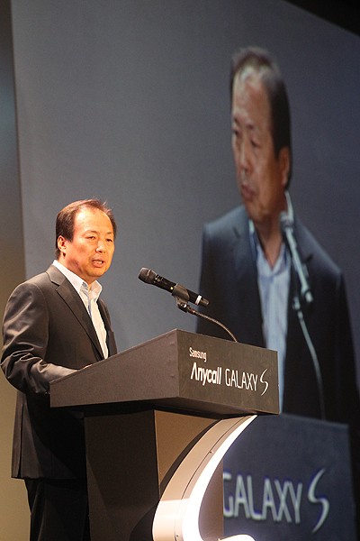 삼성전자 신종균 무선사업부 사장이 8일 오전 서초동 삼성전자 다목적홀에서 삼성전자의 스마트폰 '갤럭시S'를 소개하며 인사말을 하고 있다.