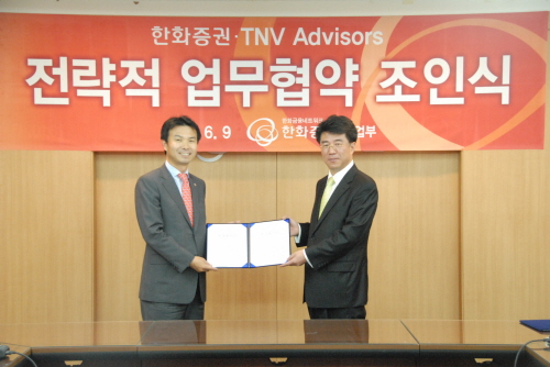 ▲한화증권과 TNV어드바이저가 전략적 업무제휴를 체결하고 기념촬영 모습. 오른쪽 한화증권 박원희 WM지역사업부장, 왼쪽 TNV 백정선대표이사.