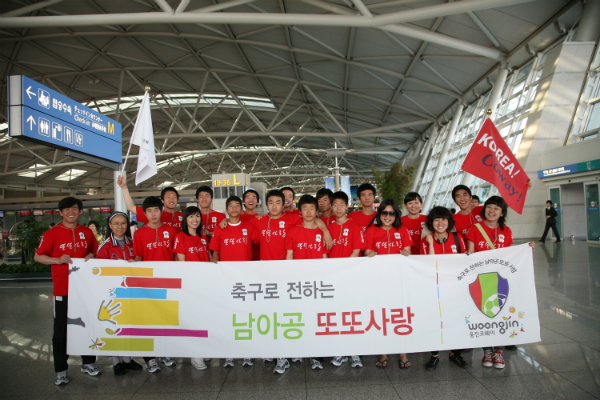 ▲생활환경기업 웅진코웨이(대표 홍준기, www.coway.co.kr)가 대한민국·남아공 축구 꿈나무들의 월드컵 응원의 꿈을 실현시켜 주기 위해 마련한 '2010 축구로 전하는 남아공 또또사랑 캠페인'에 참가하는 '남아공 또또봉사단' 이 9일 인천공항에서 출국을 앞두고 파이팅을 외치고 있다.