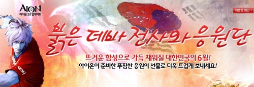 10일 엔씨소프트에 따르면 이번 이벤트는 아이온 고객에게 의상을 붉은 색으로 염색할 수 있는 ‘태극 레드 염색약’을 비롯해 ‘붉은 데바 머리띠’, ‘불꽃 머리’, ‘슈고 펫’ 등을 선물로 증정해 자신의 캐릭터를 ‘붉은 데바’로 꾸미고 보다 재미있게 응원을 즐길 수 있게 했다.