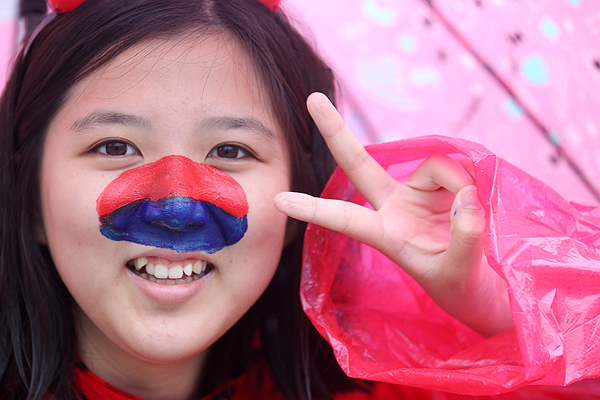 12일 2010 남아공 월드컵 대한민국-그리스 경기가 시작되기전 서울광장에서 재미있는 페이스 페인팅을 한 여학생이 포즈를 취하고 있다.