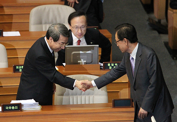 14일 오전 국회 본회의에서 박희태 국회의장과 정운찬 국무총리가 악수로 인사하고 있다.