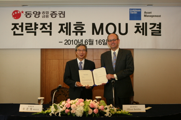동양종합금융증권과 골드만삭스자산운용은 16일 서울 소공동 롯데호텔에서 유준열 대표와 올리버 볼라이도(Oliver Bolitho) 대표가 참석한 가운데 자산관리(Wealth Management)부문의 전략적인 업무 제휴를 위한 양해각서(MOU)를 체결했다고 밝혔다.