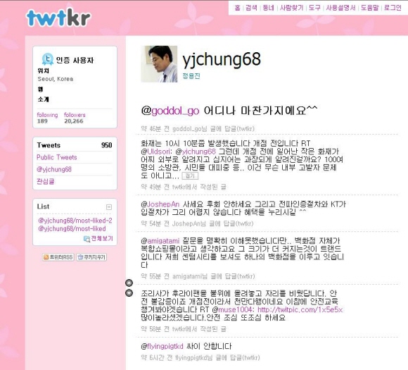 특히 16일 화재와 관련해 정 부회장의 트위터에 올라있는 글을 보면 알 수 있다. 다음은 정 부회장이 자신의 트위터에 리트윗(메시지를 자신의 팔로워에게 재전송하는 것)한 내용이다.