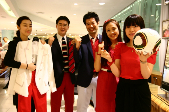 17일 열리는 아르헨티나전을 앞둔 16일 현대백화점 무역센터점 5층 코디바에서 백화점 직원들이 빨간색 의상, 넥타이, 행커치프, 신발 등을 활용한 출근착장 컨셉을 선보이고 있다. 코디바는 현대백화점 무역센터점,목동점이 운영하는 무료 스타일링 상담 서비스다. 특히 월드컵 기간중엔 의상,소품을 활용한 응원 복장 코디 상담도 해준다.