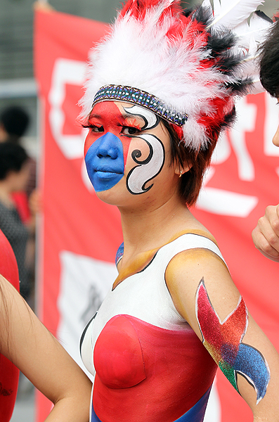 대한민국과 아르헨티나와의 조별리그 2차전을 앞둔 17일 오후 삼성동 거리응원을 나온 한국종합예술대학 한 학생의 바디페인팅이 눈길을 끌고 있다.