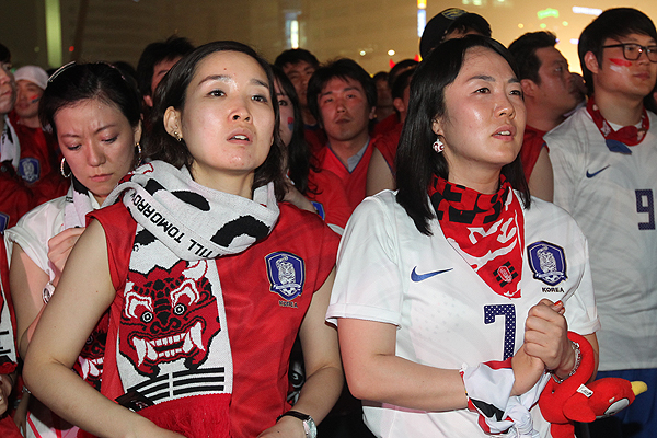 2010 남아공 월드컵 대한민국-아르헨티나 경기가 열린 17일 서울광장에서 거리응원을 하던 붉은악마 응원단이 경기 막판 아르헨티나에게 네번째 골을 허용하자 안타까워하고 있다.